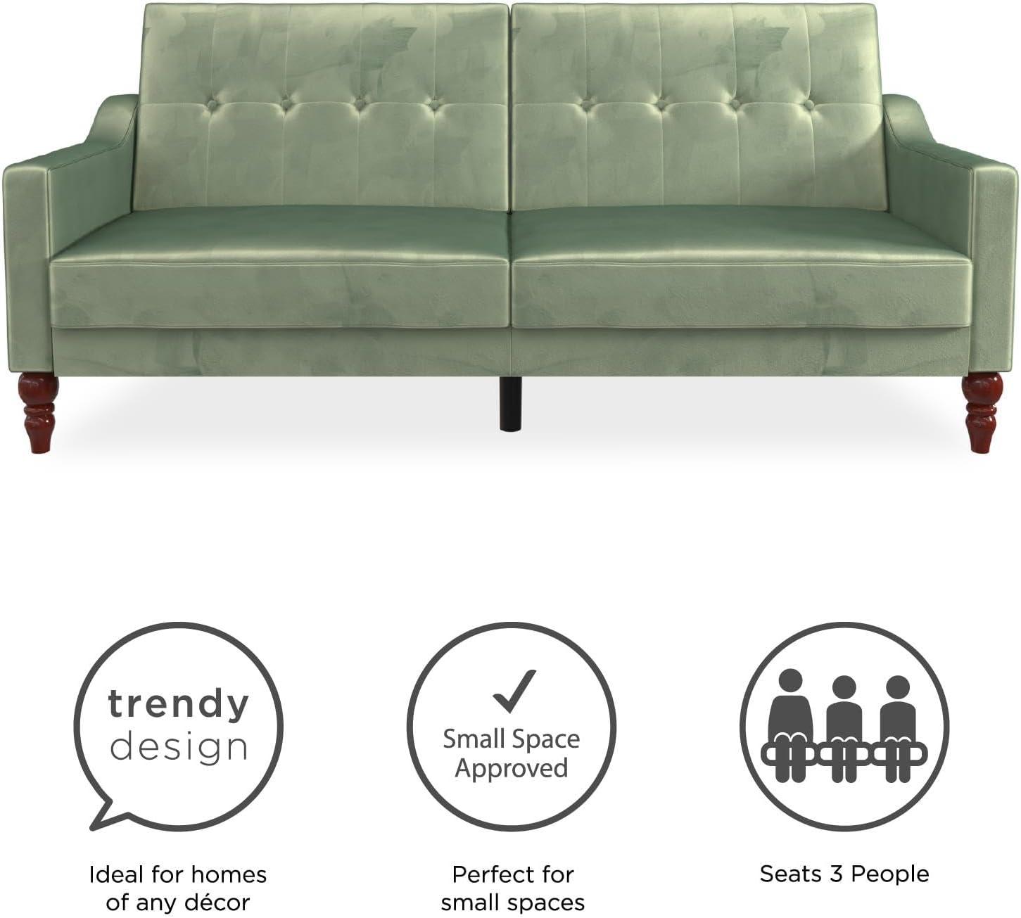 Novogratz Beatrice 79 Inch Futon Sofa Bed in Velvet Fabric, Upholstered Couch Sleeper with Tufted Back, Baroque Legs, Teal
