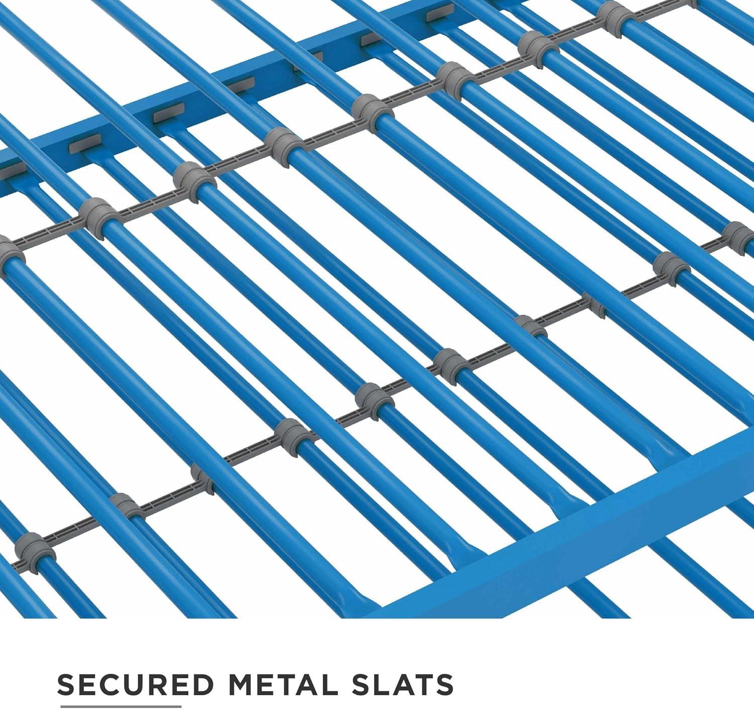 Sturdy metal frame construction with side rails and heavy duty steel slats that do not require additional foundation