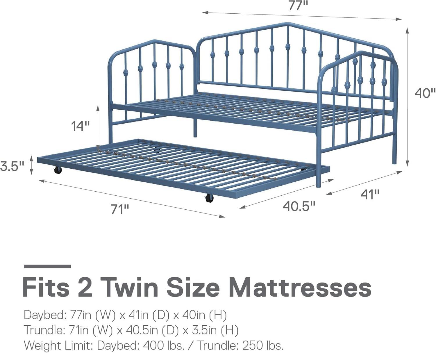 Modern and industrial, the Novogratz Bushwick Metal Twin Daybed and Trundle is the perfect understated centerpiece for your bedroom or living room décor. The round finials on the backrest and arms elevates this simple daybed into a piece of furniture that will be the envy of all your friends. The Bushwick comes with a rollout trundle with four casters (two locking and two non-locking) to allow your overnight guests or children's friends to sleep soundly. The daybed and trundle set fits two standard twin size mattresses with a maximum thickness of 8 inches (sold separately). What's more, thanks to the secured metal slats on both the daybed and the trundle, you do not require any additional box spring or foundation! Available in multiple color options to complement your room aesthetic, the Novogratz Bushwick Metal Daybed and Trundle is perfect for your living room, your guest bedroom or your child's bedroom.