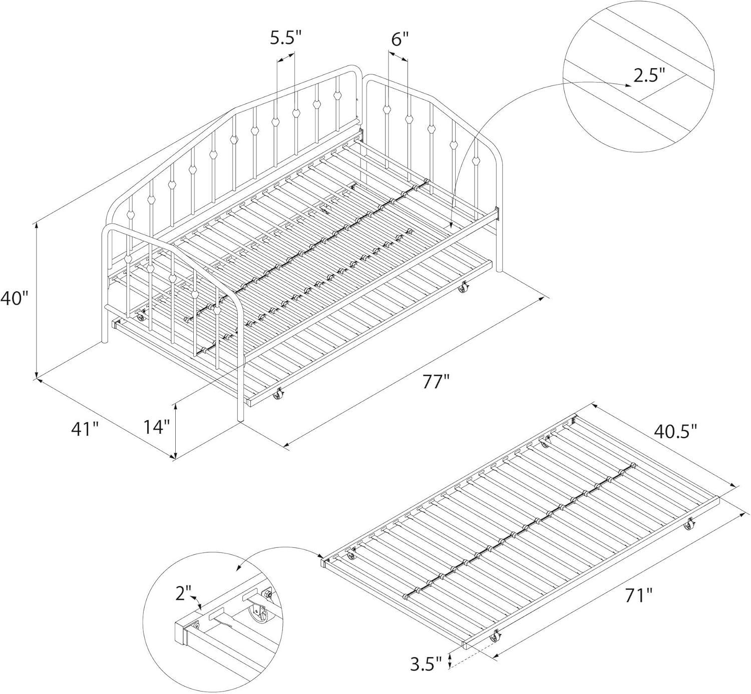 Product dimensions: Daybed – 77″L x 41″W x 40″H. Trundle – 71″L x 40.5″W x 3.5″H. Net weight: 59 lbs. Shipping dimensions: 76″L x 35″W x 6″H. Gross weight: 74 lbs. Weight limit – Daybed: 400 lbs. Trundle: 250 lbs.