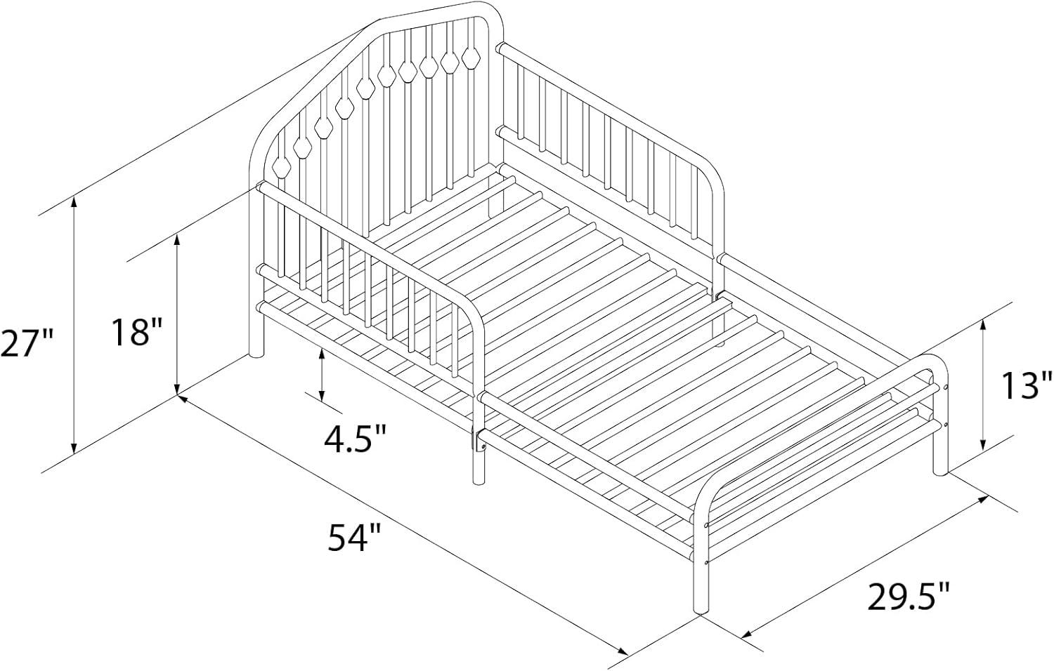 A transition furniture piece helping young boys and girls take the next step out of the nursery and into their very own kids bedroom space, the Novogratz Bushwick Metal Toddler Bed combines modern farmhouse style with consciously safe design geared for growing children. Your child will easily be able to climb in and out of the low height platform bed frame without assistance from mom or dad. Plus, the bed’s protective curved edges and anti-fall dual-sided guard rails shield toddlers from sharp turns in the middle of the night. With a Jenny Lind like arched headboard that shows off fanciful round finial posts and a low-lying footboard, this vintage look toddler bed is JPMA Certified and designed with all applicable ASTM and CPSC safety standards in mind. Fashioned from strong steel with secured metal slats, your child’s standard size crib and toddler bed mattress (not included) is completely supported. Offered in multiple finishes.