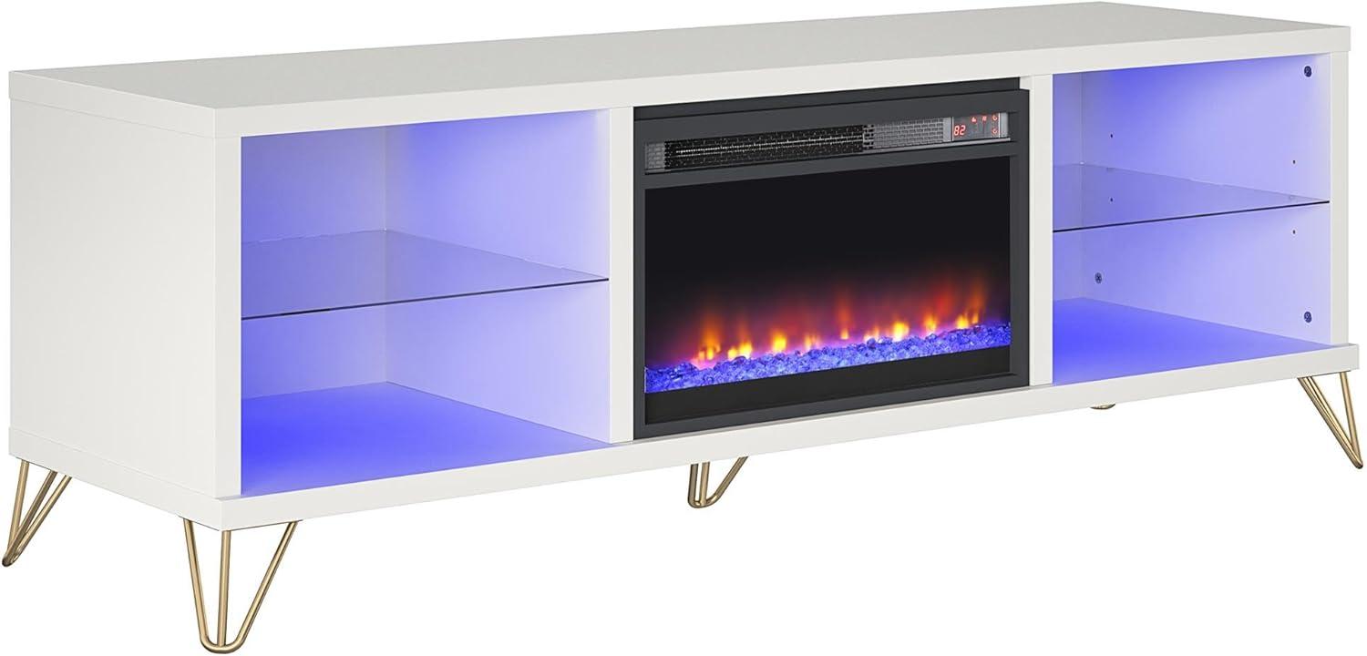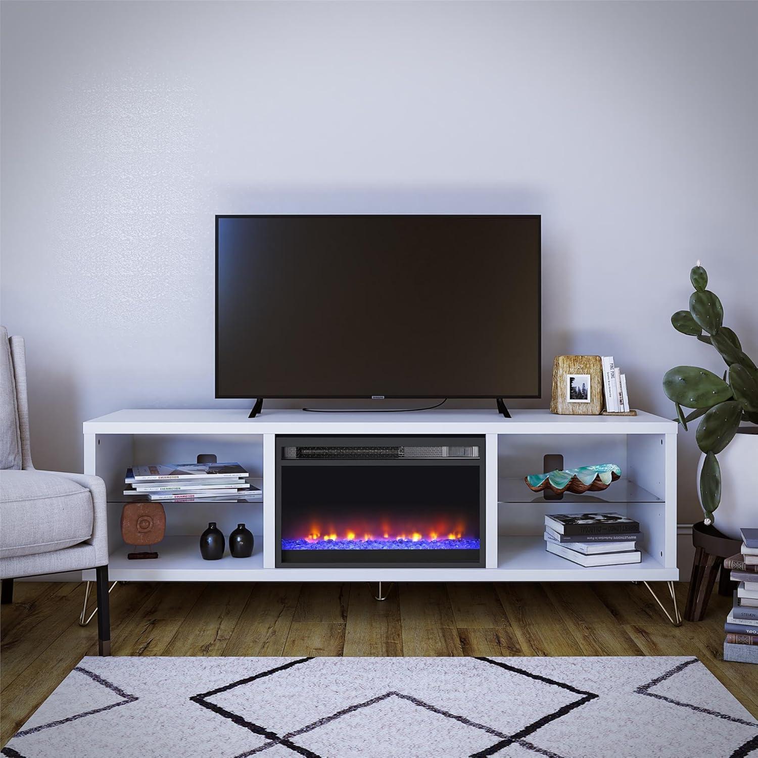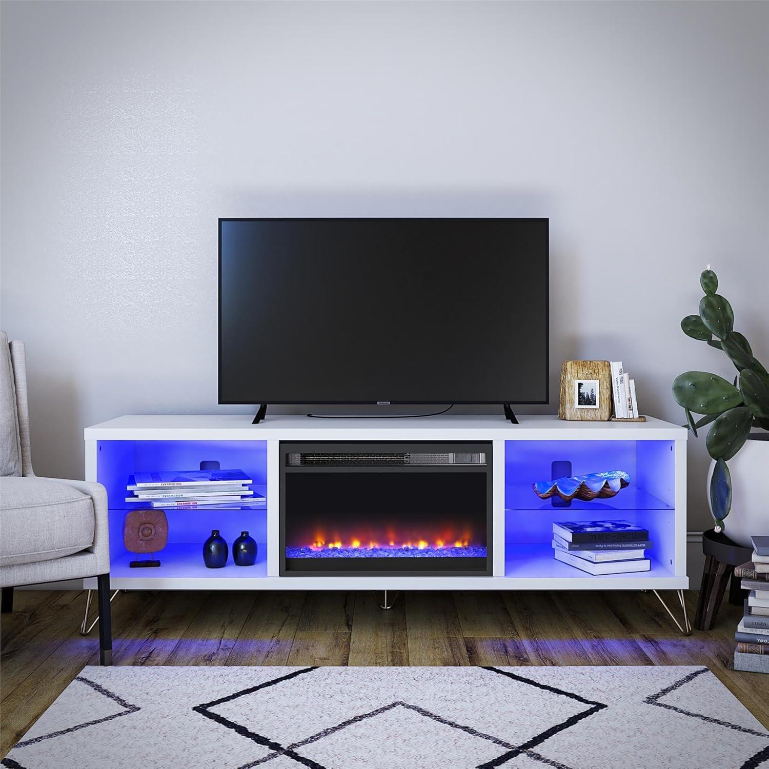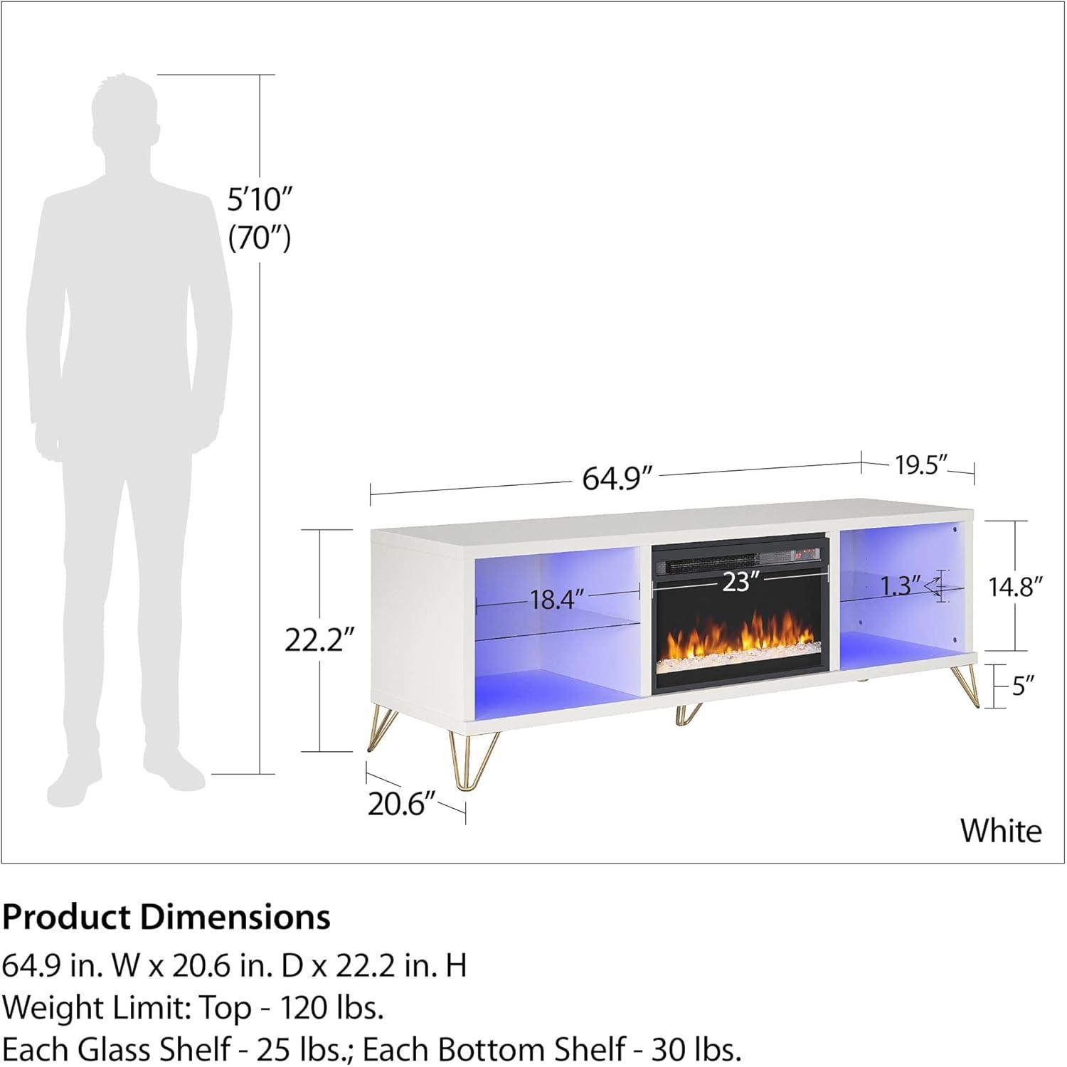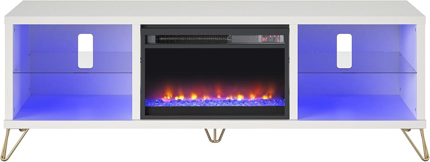 Give your living room a mid-century modern makeover with the Novogratz Finley Fireplace TV Stand. Don't let the simple look fool you, this Stand comes with a 23″ modern electric fireplace insert with a lustrous white crystal ember bed. Ready to warm up a 400 square foot room with the touch of a button, you can relax knowing that timers will take care of the rest. If you want to simply enjoy the look of the flames without the heat, use the included remote to switch off the heat option and pick your flame brightness. The fun doesn't stop there though. On either side of the fireplace insert are 2 shelves, 1 glass, that hold your entertainment components, remotes and more. Both of the side shelves are illuminated with lights to coordinate with the glowing fireplace. These lights can be turned off if you prefer not to have them on. Made of laminated particleboard and hollow core with metal feet and tempered glass shelving, the neutral finish means this Stand easily fits into any style. The top can hold most 70″ flat paneled TVs with a maximum weight of 120 lbs. The TV Stand ships flat to your door and requires assembly upon opening. Two adults are recommended to assemble. After assembly, the Stand measures to be 64.9″ W x 20.6″ D x 22.2″ H.