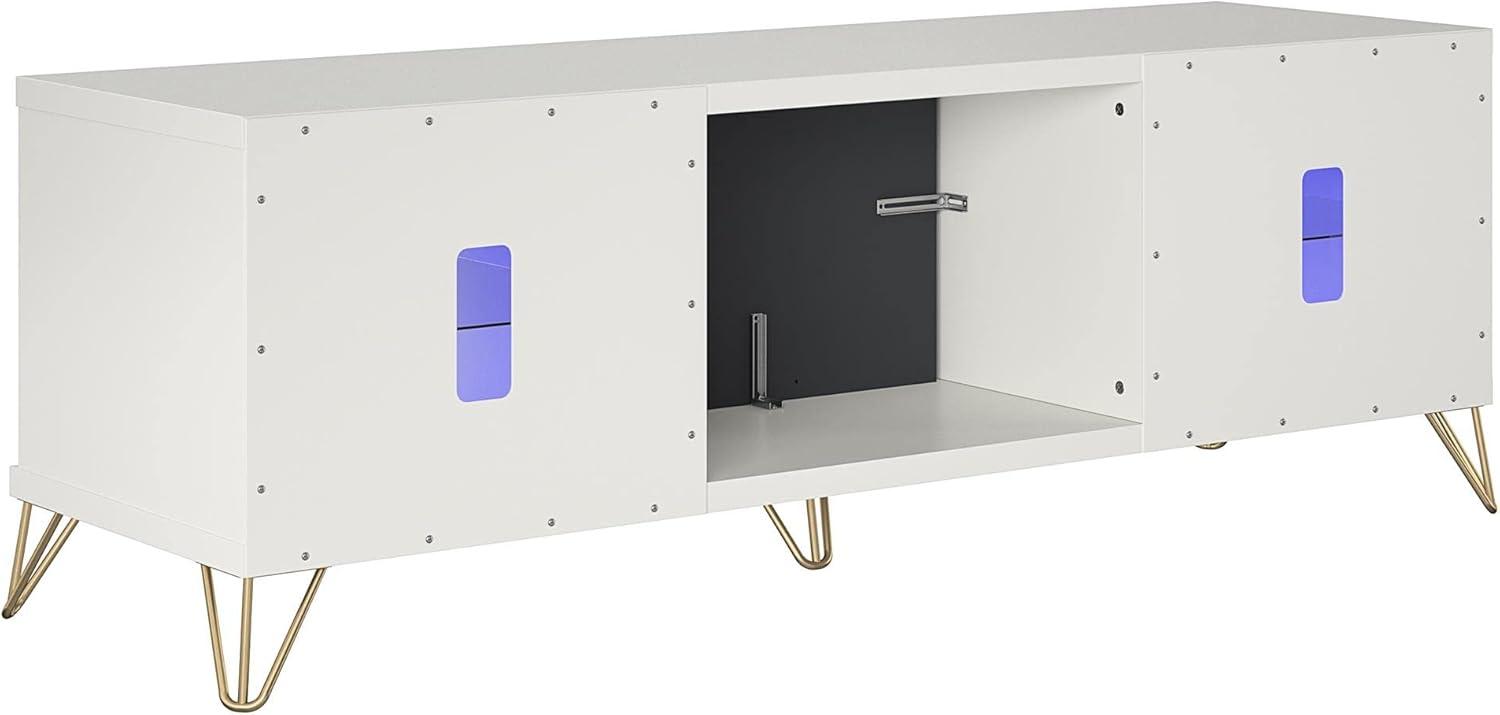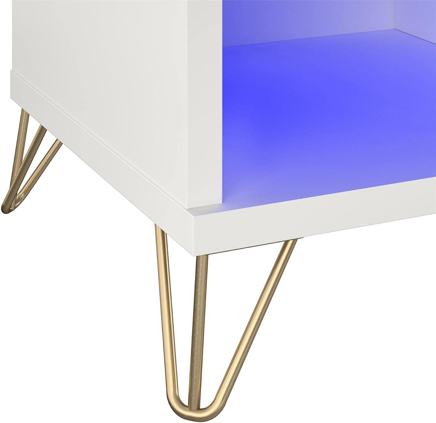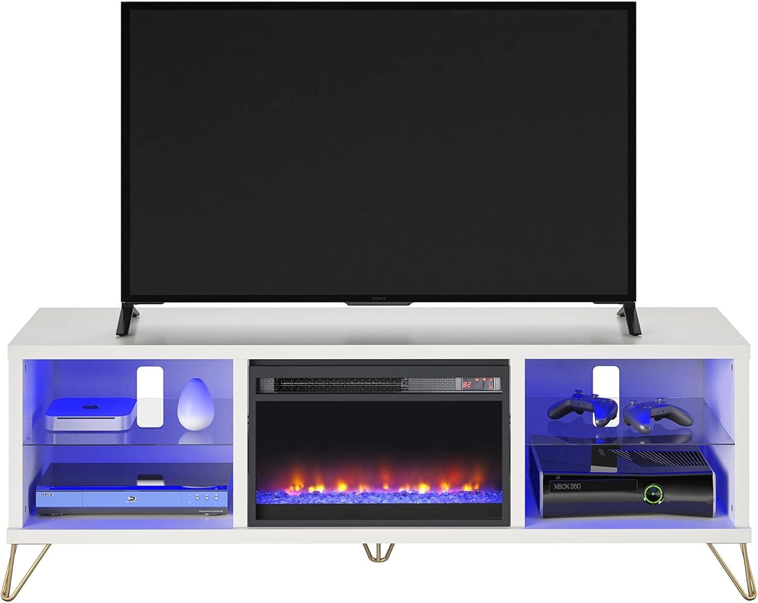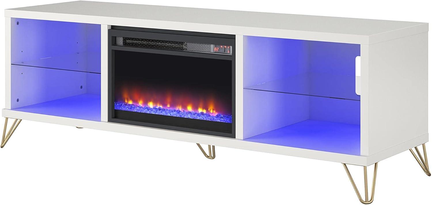 Give your living room a mid-century modern makeover with the Novogratz Finley Fireplace TV Stand. Don't let the simple look fool you, this Stand comes with a 23″ modern electric fireplace insert with a lustrous white crystal ember bed. Ready to warm up a 400 square foot room with the touch of a button, you can relax knowing that timers will take care of the rest. If you want to simply enjoy the look of the flames without the heat, use the included remote to switch off the heat option and pick your flame brightness. The fun doesn't stop there though. On either side of the fireplace insert are 2 shelves, 1 glass, that hold your entertainment components, remotes and more. Both of the side shelves are illuminated with lights to coordinate with the glowing fireplace. These lights can be turned off if you prefer not to have them on. Made of laminated particleboard and hollow core with metal feet and tempered glass shelving, the neutral finish means this Stand easily fits into any style. The top can hold most 70″ flat paneled TVs with a maximum weight of 120 lbs. The TV Stand ships flat to your door and requires assembly upon opening. Two adults are recommended to assemble. After assembly, the Stand measures to be 64.9″ W x 20.6″ D x 22.2″ H.