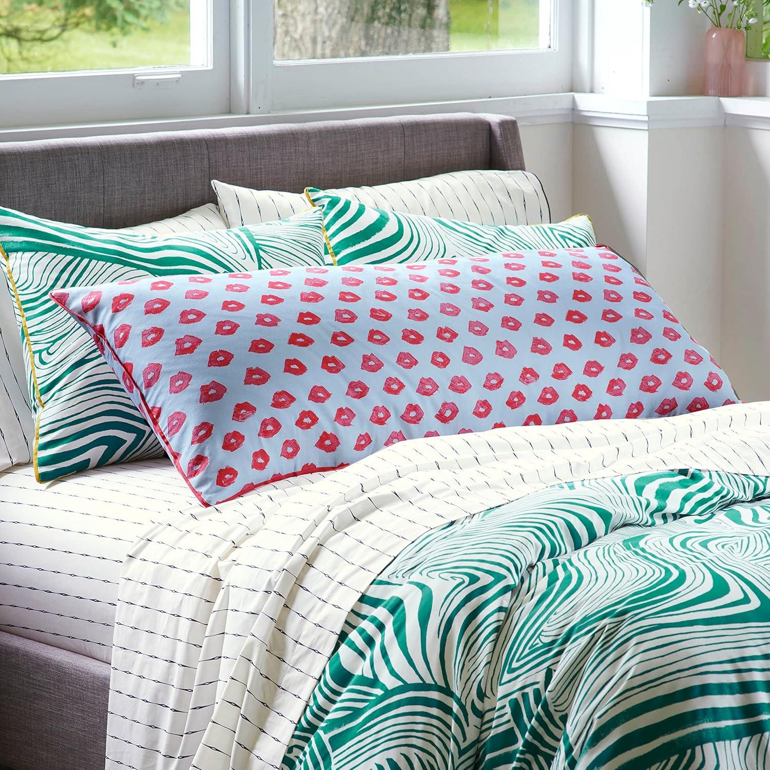 Blow goodnight kisses with the flirty allover lips on the stylish Novogratz Painted Lips Printed Body Pillow. Not only does it add a pop of fun to any sofa or bed, its generous, four-foot length is perfect for curling up and relaxing, hanging out around the house, or getting a good night’s sleep. Its 100-percent Cotton cover gives it a super-soft feel and its 100-percent Recycled Polyester fill ensures a lofty shape that lasts and reduces the burden on our oceans and landfills. Contrast-color piped trims add a tailored touch. The Novogratz by Utica Painted Lips Printed Body Pillow is created using cotton whose production is better for the environment in which it grows. And because its shell fabric is STANDARD 100 by OEKO-TEX certified, it carries the MADE IN GREEN label, so you’ll sleep well knowing it’s free of harmful dyes and finishes. Simply put, this soft, sustainable body pillow is a dream for you and the planet. Created in collaboration with husband-and-wife interior design duo Cortney and Robert Novogratz, the entire Novogratz by Utica Printed Body Pillow Collection shows off the couple’s inspiring boutique design style. For over 25 years, the Novogratz have integrated colorful and playfully modern thinking into everything they do, including raising seven children. A family of nine has given them a unique perspective on the needs of the modern family, and they love nothing more than creating impactful, beautiful designs that families of all kinds can live with every day. Machine wash warm with similar colors. Do not bleach. Tumble dry medium and remove promptly. Warm iron as needed. Cover fabric responsibly made of 100% Cotton Filled with 100% Recycled Polyester to reduce the burden on our oceans and landfills. Features a flirty allover lips print. Coordinates perfectly with Novogratz printed comforter and sheet sets. Machine washable and dryer safe. Dimensions: 20-inch W x 48-inch L.