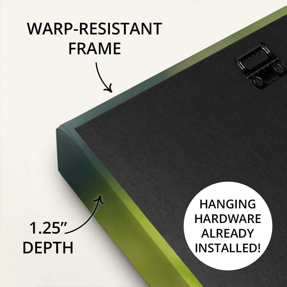 READY TO HANG: Canvas comes with pre-installed hanging hardware already attached to the back of the product, so all that remains once received is hanging a nail on your wall for final installation. Infographic for hardware shown in product images.